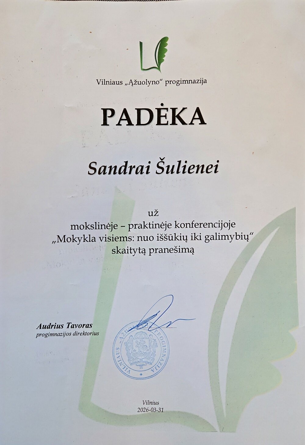 Šių metų kovo 31 dieną mūsų gimnazijos I e ir II e klasės vadovės Helene Kulik ir Sandra Šulienė dalyvavo mokslinėje-praktinėje konferencijoje „Mokykla visiems: nuo iššūkių iki galimybių“, kuri vyko „Ąžuolyno“ progimnazijoje.